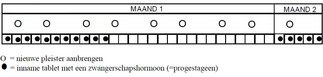 Twee behandelingsschema?s kunnen worden toegepast:1. Cyclische behandelingU gebruikt gedurende 3 opeenvolgende weken de SYSTEN pleister, gevolgd door 1 week zonder behandeling. De SYSTEN pleister moet tweemaal per week op de huid worden aangebracht. Dit betekent dat u om de 3 à 4 dagen de oude pleister moet verwijderen en een nieuwe pleister op een andere plaats op de huid moet kleven. Vb. U start de behandeling op een maandagmorgen, dan vervangt u deze pleister op donderdagavond door een nieuwe pleister (zie schema). Dit doet u gedurende 3 weken (= 6 pleisters). Daarna volgt 1 week zonder behandeling. Na deze week start u weer opnieuw met 3 weken behandeling (= 6pleisters).Uw arts geeft u waarschijnlijk ook een behandeling met een ander hormoon, een progestageen. Deprogestageentabletten dient u in te nemen gedurende de laatste 10 à 12 dagen van de 21 dagen dat uoestrogenen gebruikt (zie schema). Gedurende de 4de week, de week waarin u geen pleisters gebruikt,gebruikt u ook geen geneesmiddel met progestagenen. Tijdens de pleistervrije week, debehandelingsvrije week, treedt meestal een bloeding op.Eenvoudiger : De eerste 3 pleisters gebruikt u zonder tabletten. Bij de 3 volgende pleisters neemt uook elke dag een tablet in. Daarna volgt een week zonder pleister en zonder tabletten. Na deze weekherbegint u.2. Continue behandelingDe arts zal aanraden deze methode te gebruiken bij vrouwen bij wie de baarmoeder werdweggenomen of bij vrouwen die niet tevreden waren over de cyclische methode omwille van ernstigeklachten tijdens de week zonder pleisters.Bij deze methode gebruikt u zonder ophouden elke week 2 pleisters die u om de 3 à 4 dagenvervangt, vb. elke maandagochtend en donderdagavond.Uw arts geeft u waarschijnlijk ook een behandeling met een ander hormoon, een progestageen. Deprogestageentabletten dient u in te nemen gedurende de eerste 10 à 12 dagen van elke maand. Deverdere dagen van de maand neemt u geen tablet. Na stopzetten van het innemen van de tablettenmet zwangerschapshormoon (= progestageen) treedt meestal een bloeding op.Vrouwen zonder baarmoederTenzij u een afwijking heeft gehad waarbij het baarmoederslijmvlies zich ook op plaatsen buiten debaarmoeder bevindt (endometriose), hoeft, als u geen baarmoeder meer heeft, deoestrogeenbehandeling niet met progestagenen gecombineerd te worden.